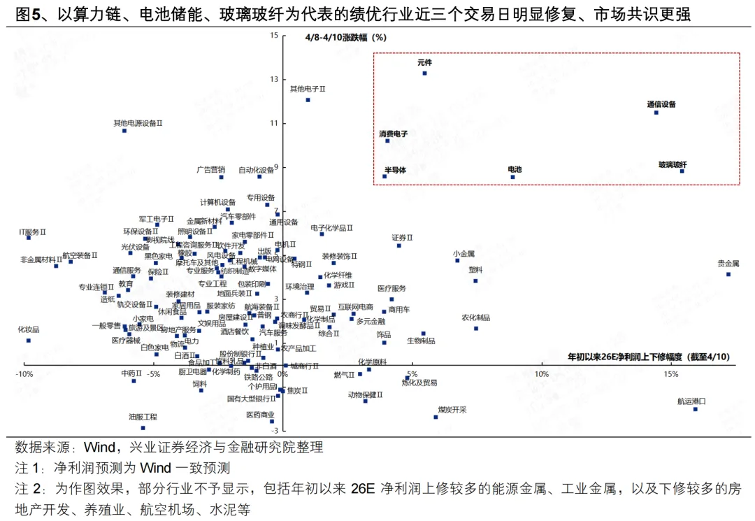 更重要的是,进入业绩披露期后,近期“超跌反弹”的“明线”中,背后是景气主导的“暗线”。一方面,以算力链、电池储能、玻璃玻纤为代表的绩优行业,近三个交易日明显修复、市场共识更强。