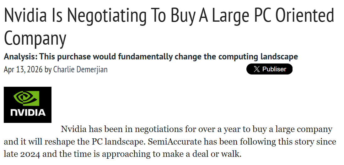 周一盘中,行业网站SemiAccurate刊文称英伟达正在寻求一笔“重塑PC市场格局”的并购。