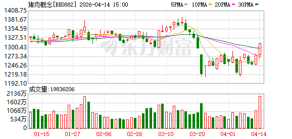 继昨日大涨之后,4月14日,A股猪肉概念再度异动,截至早间收盘,板块上涨1.83%,涨幅居概念板块前列。个股方面,正邦科技、天邦食品涨停,傲农生物涨超6%,大禹生物涨超5%,神农集团、天康生物涨超4%,新希望、巨星农牧、牧原股份、东瑞股份、唐人神、新五丰、温氏股份等多股涨超2%。