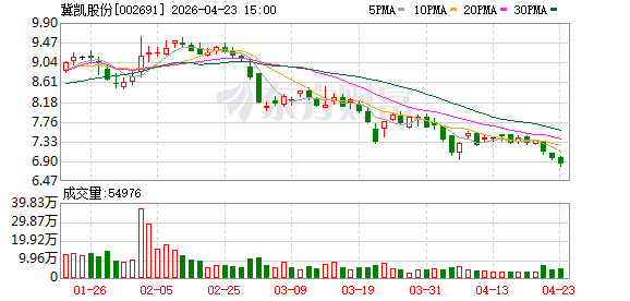 今年以来,冀凯股份股价整体走势疲软。数据显示,截至2026年4月23日收盘,冀凯股份今年已累计下跌24.53%。若公司最终年报确认触及退市风险警示条件,股票简称将被冠以“*ST”标识,届时可能面临更大的流动性压力和估值下行风险。