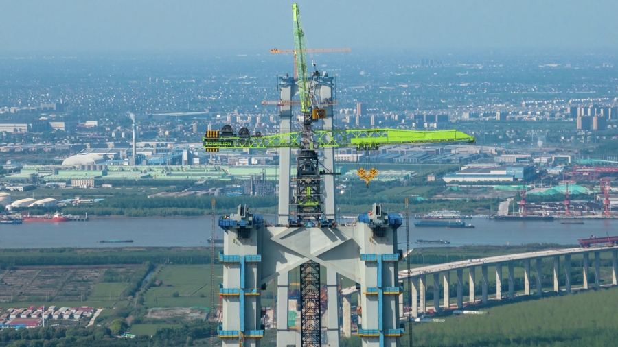 同日,由江苏省交通工程建设局建设,中交二公局承建的张靖皋长江大桥南航道桥南主塔主索鞍全部吊装完成,标志着世界首创的“自行走索鞍”在该超级工程中全部成功安装,为后续主缆架设奠定基础。
