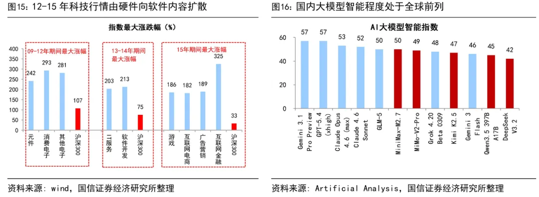 结构上,行业配置应适当均衡。前文提到,本轮反弹中通信等成长行业拥挤度阶段性较高,同时消费等传统价值板块热度已降至低位,当前可适当均衡布局。中期看产业趋势向上的科技成长等高景气领域仍是重要主线。当前以AI为代表的科技产业正处在新一轮向上大周期中,国内Deepseek、千问、Kimi等AI大模型的智能化水平已处于全球前列。4月24日DeepSeek V4发布,官方表示在Agentic 能力Coding评测中,V4-Pro已达到当前开源模型最佳水平,同时原生支持100万token 上下文。在DeepSeek V4发布后,华为计算发布信息称,昇腾超节点产品全面支持DeepSeek V4。整体看,未来AI应用落地有望加速,AI应用、算力硬件以及上游的能源电力等领域值得重视。