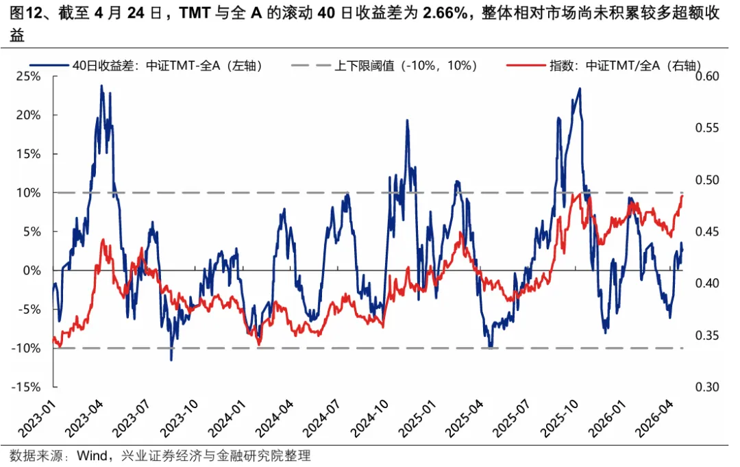 此外,从滚动收益差这一指标看,当前TMT板块整体相对市场实际上尚未积累较多超额收益,与全A滚动收益差仍有向上空间。滚动收益差这一指标对于板块阶段性顶底部有较好的指引效果。历史经验看,TMT相对全A滚动40个交易日超额收益的顶部通常在10%左右,部分行情阶段甚至能达到20%-25%。经历近期上涨后,截至4月22日,TMT与全A的滚动40日收益差仍在3.59%的较低水平,距离经验性顶部仍有向上空间,板块整体相对市场尚未积累较多超额收益。