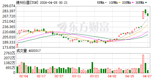 受超出市场预期的业绩刺激,4月23日,德州仪器股价大涨19.43%,次日回调1.8%。拉长时间来看,本月以来,德州仪器累计涨幅接近43%。摩根大通将德州仪器的目标价从227美元上调至280美元,维持“增持”评级。