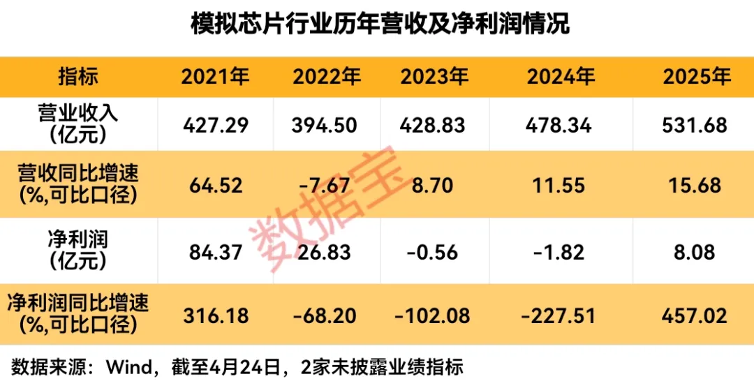 根据申万三级模拟芯片设计行业的35家公司来看,2025年,33家公司(仅2家尚未披露业绩指标)2025年实现营收近532亿元,按可比口径统计,同比增长15.68%,营收规模创2021年以来最高水平,营收同比增速创2022年以来新高;实现净利润8.08亿元,扭转过去2年亏损的局面,同比增长457.02%,净利润增速创2021年以来新高。
