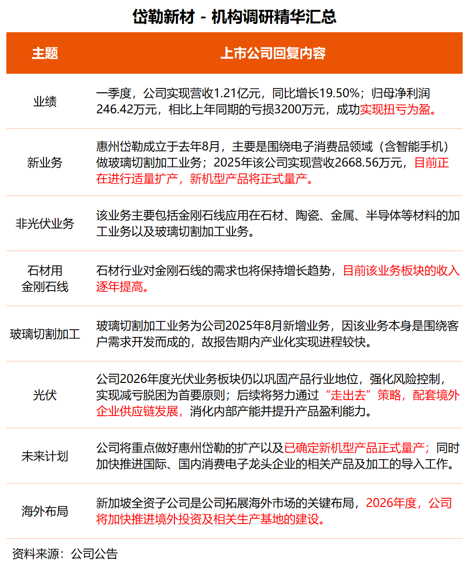 2025年,岱勒新材成功实现新业务惠州岱勒玻璃切割加工业务的产能建设进度并快速实现了规模化生产。据介绍,该公司主要是围绕电子消费品领域(含智能手机)做玻璃切割加工业务,于2025年9月已正式投产并在2025年度实现规模化生产状态。2025年度,惠州岱勒实现营业收入2668.56万元,目前正在进行适量扩产,新机型产品将正式量产。