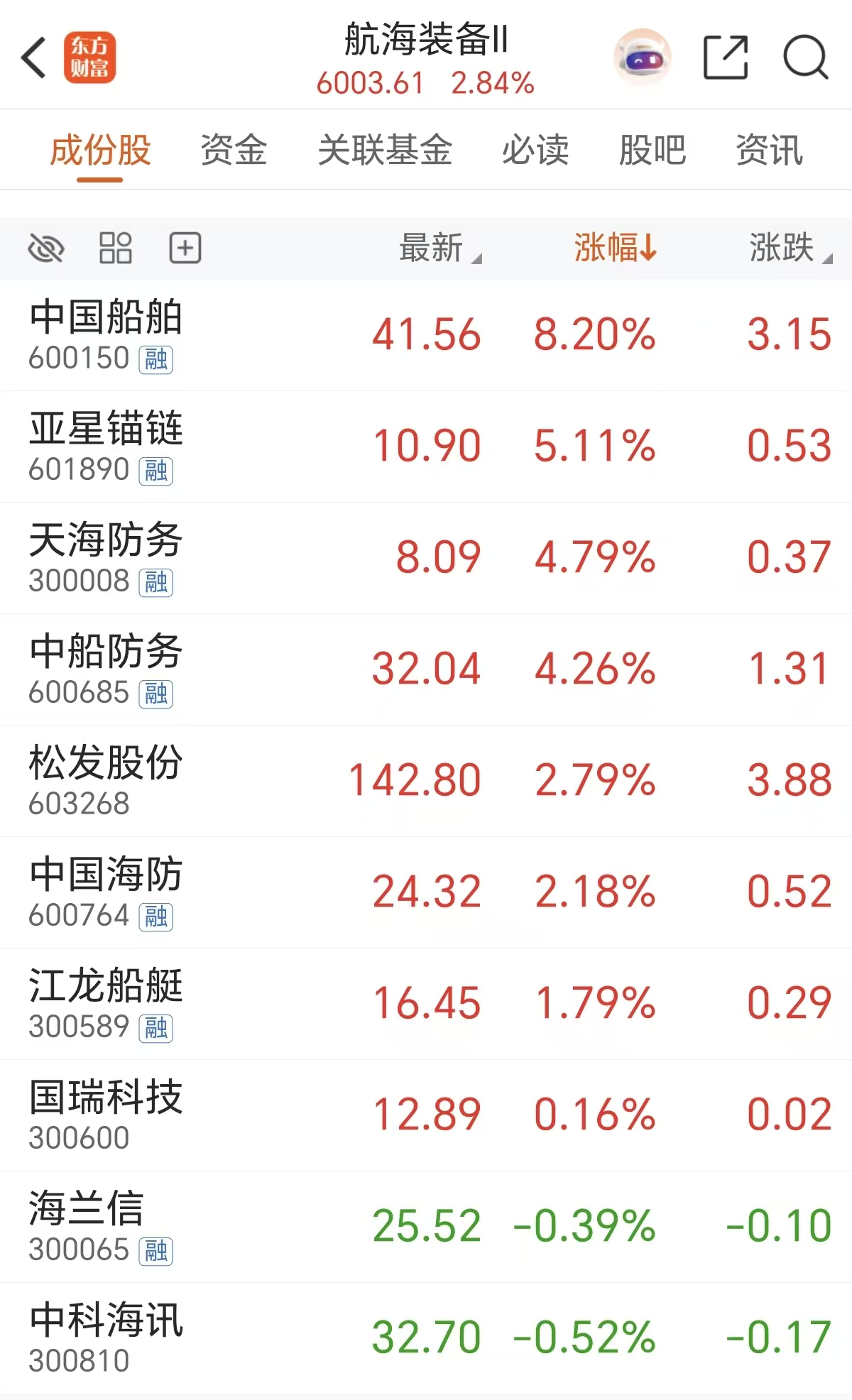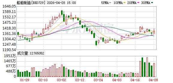 周二船舶板块逆势走强,中国船舶涨超8%,亚星锚链、天海防务等跟涨。