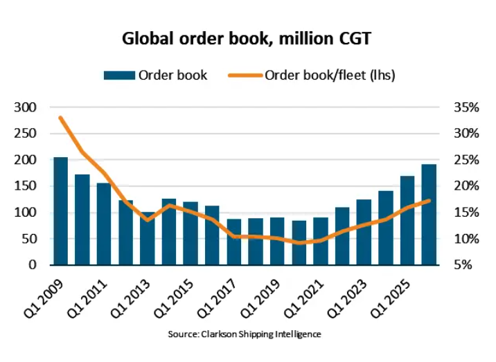 波罗的海国际航运公会(BIMCO)于 2026 年 4 月发布的最新市场数据显示,截至一季度末,全球手持订单量达1.91 亿修正总吨(CGT),创下 2011 年以来 17 年新高,相当于现有船队规模的 17%。