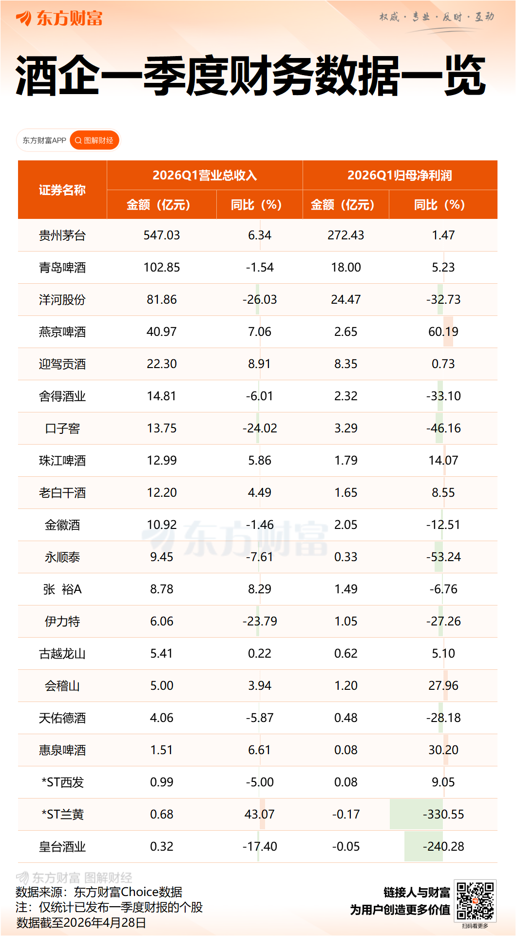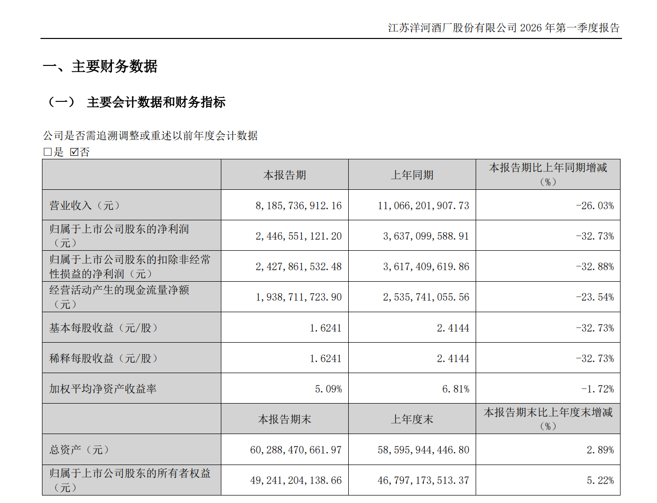 同日,洋河股份发布2026年第一季度报告,报告期内,公司实现营业收入81.86亿元,同比下降26.03%;归母净利润24.47亿元,同比下降32.73%。