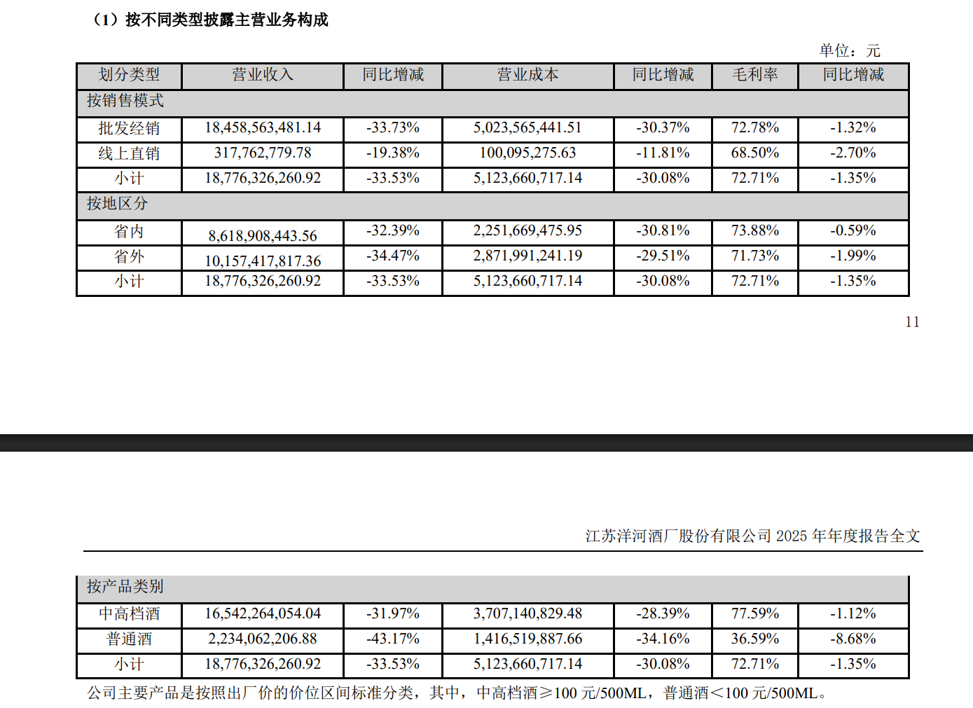 从销售模式来看,2025年,洋河股份批发经销模式实现营收184.59亿元,同比下降33.73%;线上直销模式营收3.18亿元,同比下降19.38%。按地区划分,省内实现营收86.19亿元,同比下降32.39%;省外营收101.57亿元,同比下降34.47%。