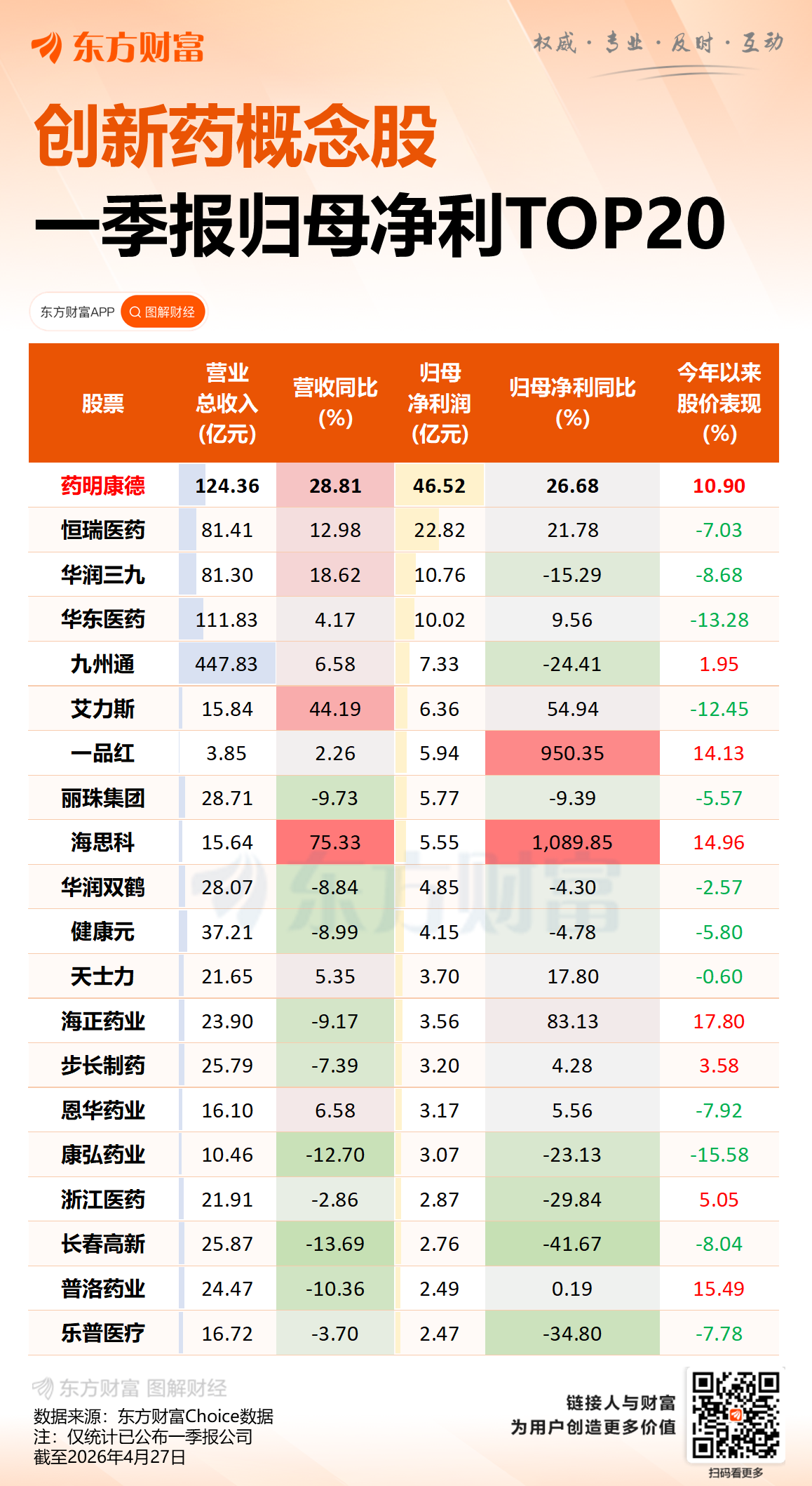 4月27日晚间,药明康德(SH603259,股价100.52元,市值2999亿元)披露的2026年第一季度报告显示:报告期内,公司实现营业收入124.4亿元,同比增长28.8%;实现归母净利润46.52亿元,同比增长26.68%。