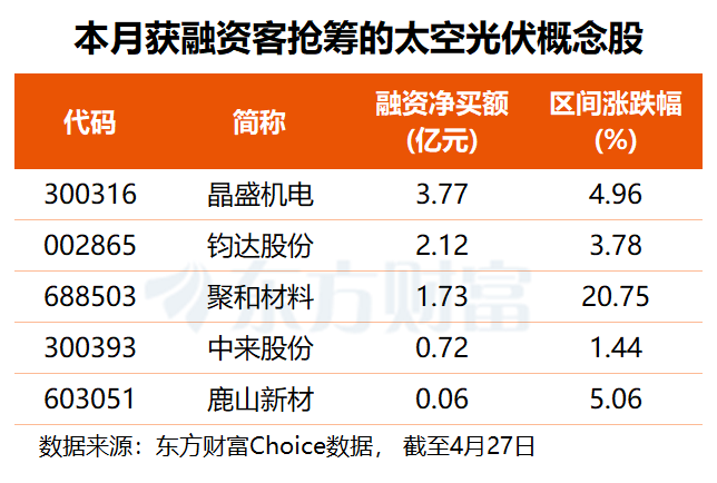 资金方面,东方财富Choice数据显示,4月以来,共5只太空光伏概念股获得融资净买入,其中,晶盛机电获杠杆资金加仓3.77亿元,钧达股份、聚合材料分别获抢筹2.12亿和1.73亿元,中来股份亦获约7200万元融资净买入。