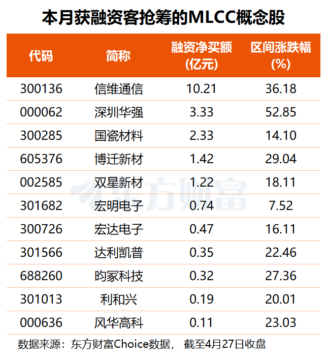 4月以来,所有MLCC概念股均录得股价上涨,博杰股份、深圳华强、三环集团月内涨幅居前。