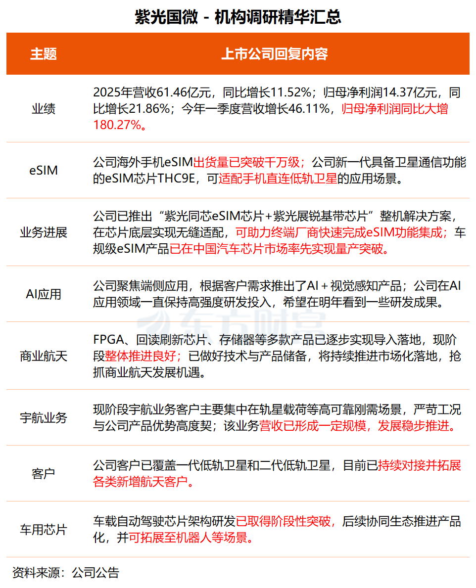 在说明会中,紫光国微表示,公司在航天领域深耕数十年,顺应国家对商业航天发展趋势布局,从技术产品上做了一系列的布局,在FPGA、回读刷新芯片、存储器、总线接口等多款产品已逐步实现导入落地,现阶段整体推进良好。