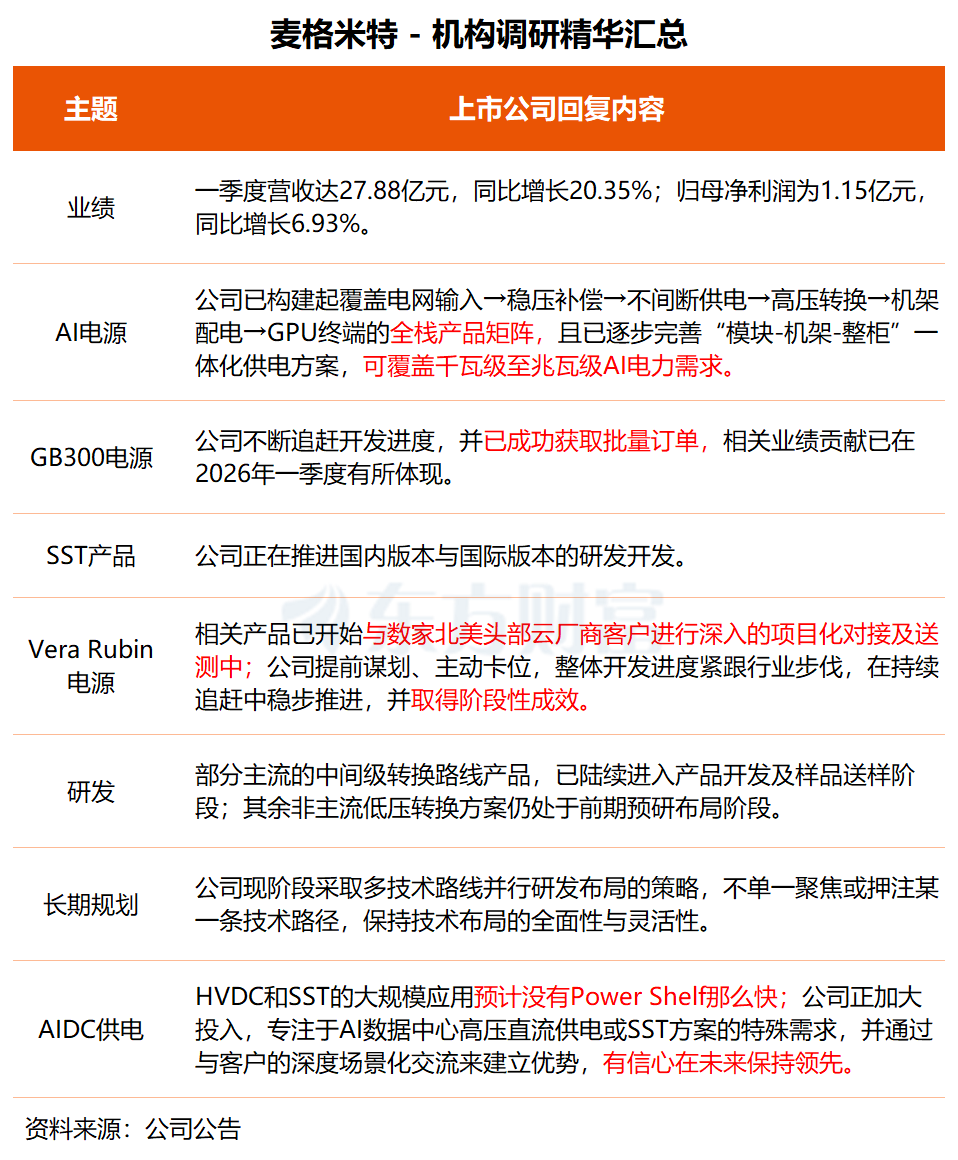在调研交流会上,麦格米特透露,在GB300电源产品上,公司不断追赶开发进度,已成功获取批量订单,相关业绩贡献已在2026年一季度有所体现;针对下一代Vera Rubin电源产品,公司在定制开发进度上进一步缩小与行业头部友商的差距,相关产品已开始与数家北美头部云厂商客户进行深入的项目化对接及送测中;SST产品也在推进国内版本与国际版本的研发。