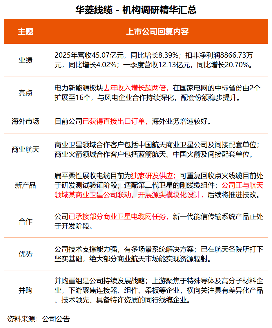 华菱线缆指出,航天领域准入门槛较高,其融合装备各领域要求更为严格,该领域具备较强的客户粘性,产品需参与客户整体设计方案并完成定型,新进入者短期难以切入。公司深耕航天领域底多年,已在航天各院所打下了坚实基础,积累了良好的行业口碑,绝大部分商业航天市场能实现资源辐射。