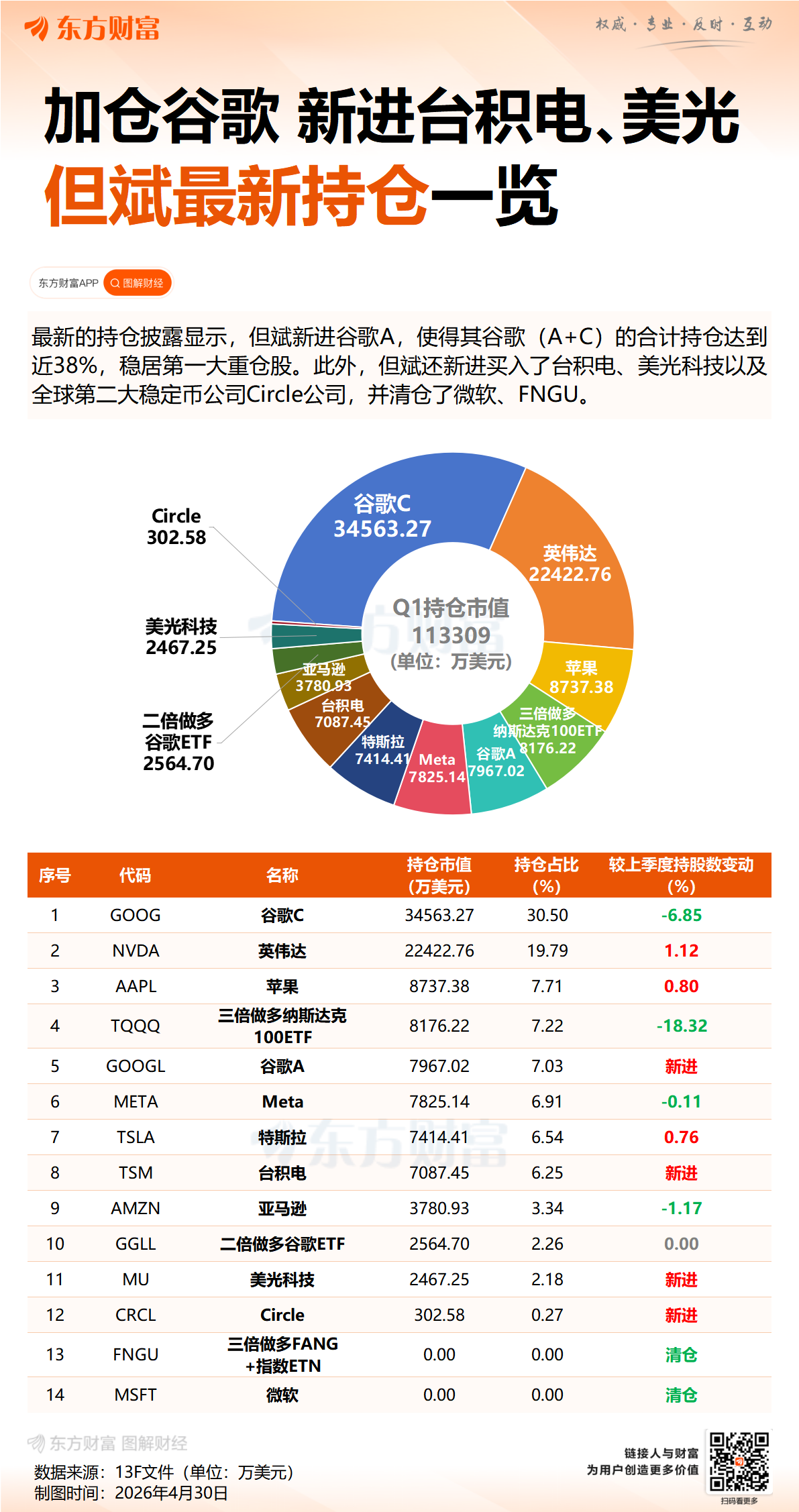 一季度,但斌大幅加仓谷歌,新进买入27.71万股谷歌A,并一举买成第五大持仓,期末持股比例达到7.03%;谷歌C则是第一大重仓股,期末持股比例为30.5%,使其谷歌(A+C)合计仓位进一步提升至37.53%,期末持股市值合计达4.26亿美元,稳居第一大重仓股。