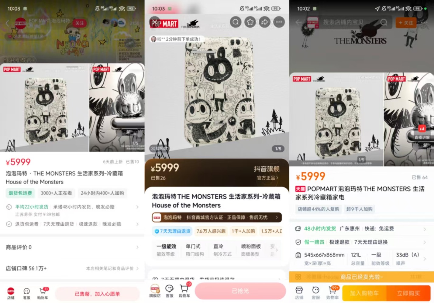 红星资本局注意到,这是泡泡玛特首次推出家电产品。4月24日,泡泡玛特官方微博宣布将上线两款THE MONSTERS生活家系列冷藏箱:Home和House of the Monsters,每款全球限量发售999台,发售价为5999元。其中,Home款由京东平台独家发售,House of the Monsters款的发售渠道覆盖京东、天猫、抖音、小红书、抽盒机等线上渠道。