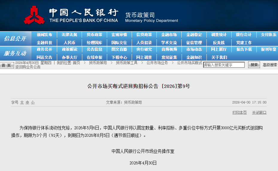 4月30日,中国人民银行发布公开市场买断式逆回购招标公告称,为保持银行体系流动性充裕,2026年5月6日,将以固定数量、利率招标、多重价位中标方式开展3000亿元买断式逆回购操作,期限为3个月(91天),到期日为2026年8月5日(遇节假日顺延)。
