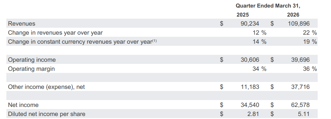 营收:1099亿美元,略好于分析师预期1072亿美元;较去年增长了20%,并创下了自2022年以来最高季度增长率。