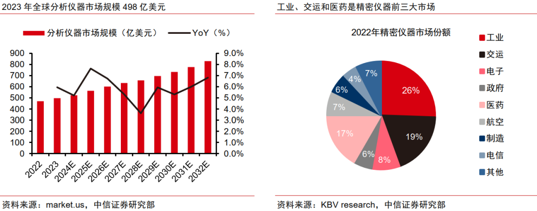 精密仪器作为现代工业和科技发展的基石,是推动产业升级、提高生产效率的重要工具。历史上有许多精密仪器获得了诺贝尔物理学、化学、生理学或医学奖。据美国商务部国家标准局评估报告(转引自机械工程学报微信公众号),仪器仪表只占其工业总产值的4%,但对GNP的影响达到66%。2023年全球分析仪器市场规模498亿美元,产品种类繁多。我国精密仪器行业起步晚,自主创新能力较为薄弱,企业规模较小,高端仪器的主要市场份额被国外厂商垄断。近年来,终端客户在供应链安全、全过程降本等多重需求的推动下,对国产仪器的态度经历了巨大的转变,“外资品牌信仰”已经在各个环节被逐步打破。