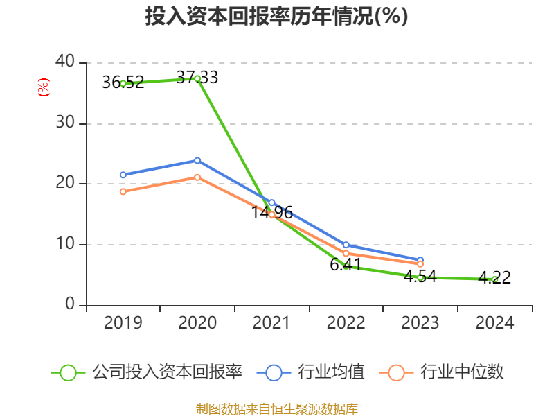 数据显示,2024年公司加权平均净资产收益率为4.49%,较上年同期下降0.75个百分点。公司2024年投入资本回报率为4.22%,较上年同期下降0.32个百分点。