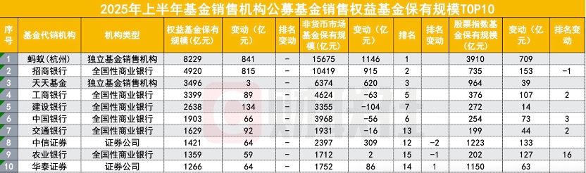 值得注意的是,2025年上半年销售机构权益基金规模保有前十排名与2024年底并无变化,蚂蚁、招商之外,天天基金以3496亿元排名第三,随后是工商银行、建设银行、中国银行、交通银行、中信证券、农业银行以及华泰证券。