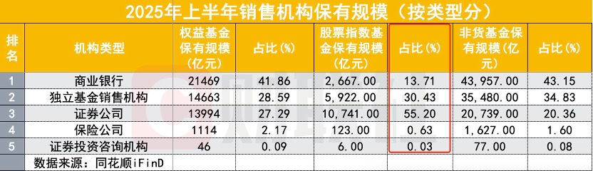 从2025年上半年百强销售机构来看,商业银行在股票指数保有规模上取得了长足的进步,保有规模2667亿元,较2024年底的1923亿元增长37.9%,更是较2024年中报翻倍,商业银行占比规模从11.29%提升至13.71%。