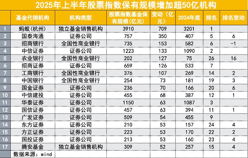 在股票指数基金的绝对增量上,有17家机构销售保有规模超过50亿元,蚂蚁基金以709亿元规模遥遥领先,国泰海通增加了350亿,招商银行、中信证券、农业银行、招商证券增加超百亿。