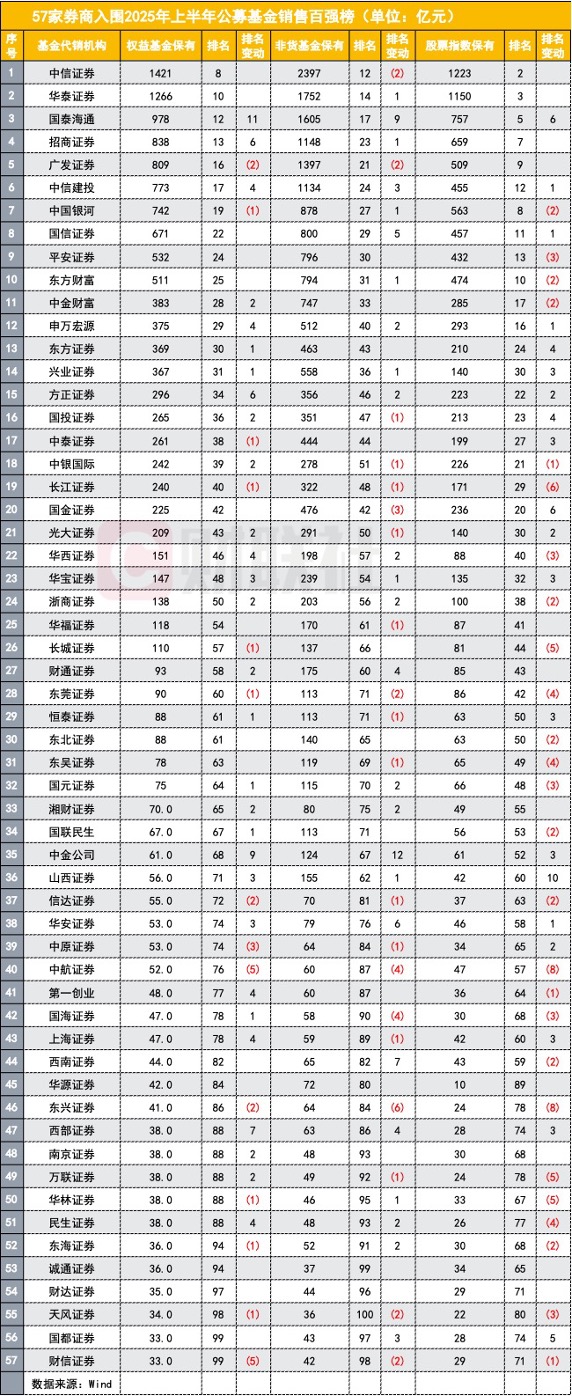 上半年的权益类百强榜单中,券商的变化仍然引人关注。总体来看,共57家进入百强榜。仅从券商排名来看,前十分别为中信、华泰、国泰海通、招商、广发、中信建投、银河、国信、平安、东方财富证券。