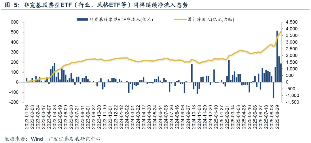 从市场各资金的高频跟踪来看,近期重要变化:①本周融资流入额超过500亿元、连续12周净流入;②居民资金或通过主动偏股基金、固收+基金、ETF入市,一方面,8月以来主动偏股基金、固收+基金新发有所回暖,另一方面非宽基ETF(类平准基金占比较少)连续4周单周净流入超100亿元,反映居民资金入市意愿仍强。