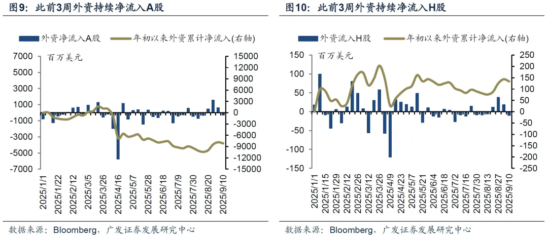 4.海外:此前外资连续3周净流入A、H股,本周尽管外资转为净流出,但幅度相较以往明显放缓。如果四季度中美关系和国内会议有预期上的变化,叠加美联储降息,那么外资有望继续贡献增量。