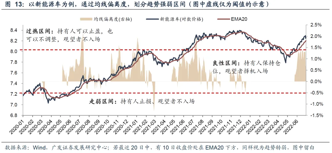 定义均线偏离度=(对数收盘价/20日EMA)-1,以衡量趋势强弱。指数移动均线(EMA)相较于普通移动均线(MA)更加灵敏,给予近期的数据权重更高,因而趋势行情中收盘价往往与EMA更贴合,阿尔·布鲁克斯在《高级趋势技术分析》中也均采用EMA20作为趋势支撑位的辅助判断。首先,趋势行情应当确保最近20日中收盘价有10日在均线上方,否则已经表明趋势转弱;随后,通过上下阈值的设定,可以将趋势行情划分为过热、良性、转弱区间。对于持有人而言,应当在趋势转弱时止损(止损之后,持有人也变成观望者)、在趋势过热时止盈/继续持有,在良性区间保持/追加仓位;对于观望者而言,应当在趋势转弱和趋势过热时保持观望,在趋势良性时择机入场。