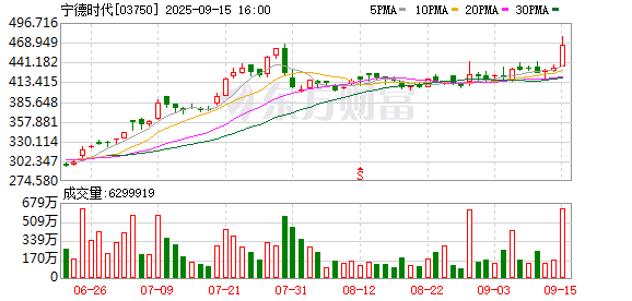 9月15日,宁德时代股价盘中突破371.52元,创2021年12月以来历史新高,总市值一举突破1.6万亿元。收盘时报收于354.70元,涨幅9.14%。