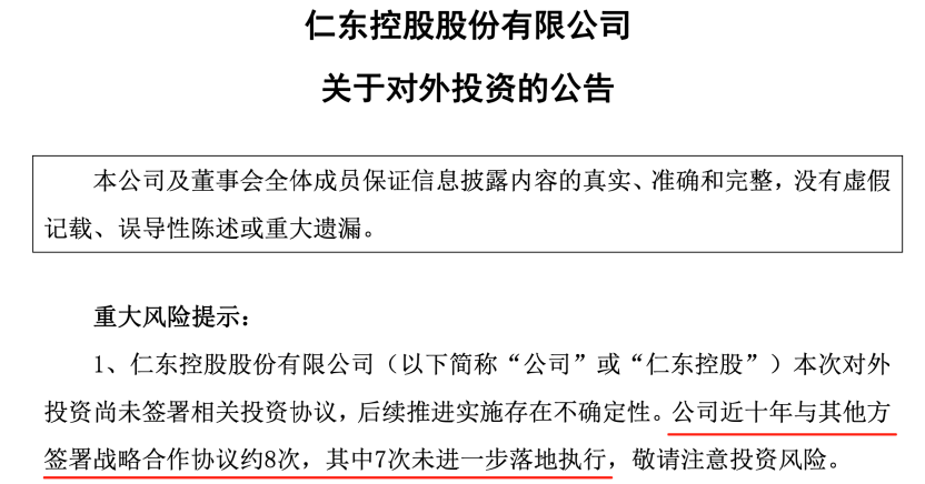 *ST仁东还提到,公司本次对外投资尚未签署相关投资协议,后续推进实施存在不确定性。*ST仁东称,公司近10年与其他方签署战略合作协议约8次,其中7次未进一步落地执行。