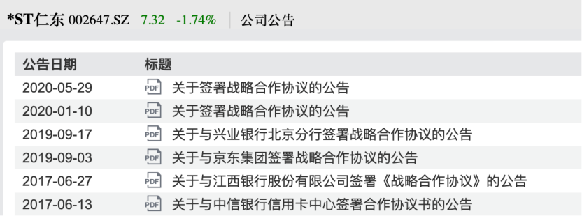 证券时报记者查询发现,近年来,*ST仁东的确先后多次发布签署战略合作协议的公告。具体合作对象包括中信银行信用卡中心、江西银行、京东集团、兴业银行北京分行等。