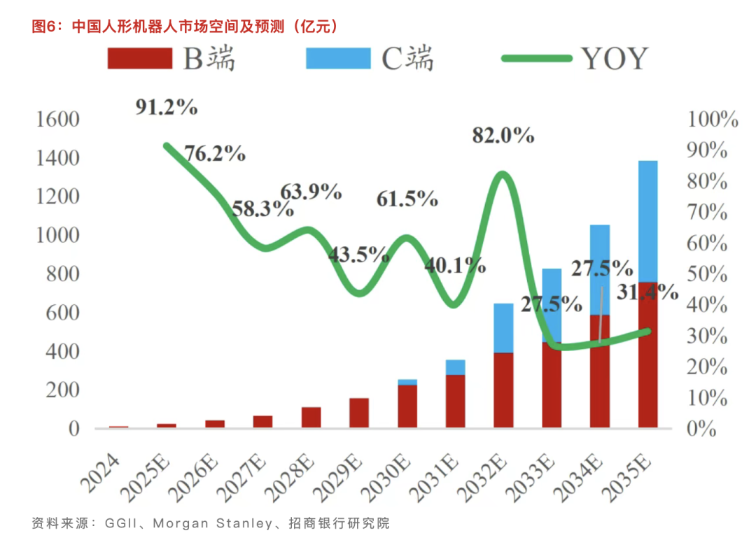 市场前景方面,招商银行研究院在最新的发布的研报预测,2025年全球人形机器人销量预计达1.24万台,市场规模63.39亿元;至2035年,销量有望突破500万台,市场规模超4000亿元。其中,中国市场出货量预计达200万台,规模接近1400亿元。然而报告也指出,尽管技术在运动控制、环境感知等领域取得突破,但受制于成本控制与场景落地的协同难题,短期内实现低成本、高可靠量产仍存挑战,全面商业化时间表尚具不确定性。