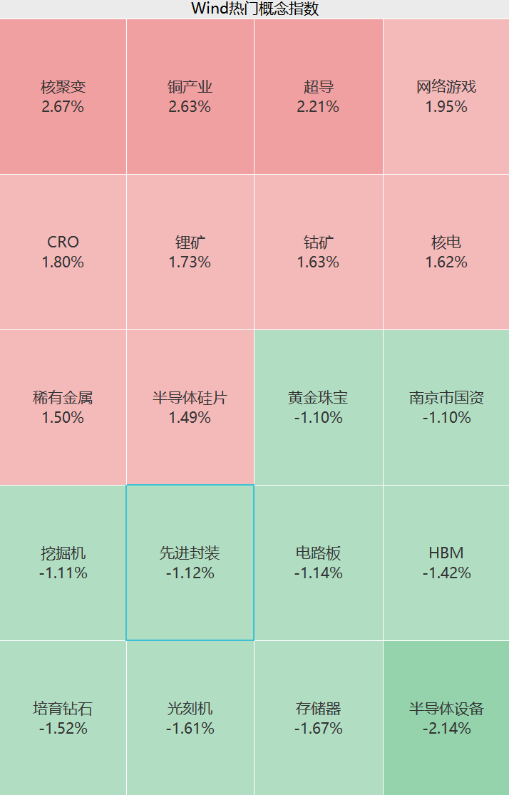 行业板块上,有色金属、传媒、电力设备、医药生物等板块涨幅居前,核聚变、铜产业、超导、CRO等概念股活跃;半导体、存储器、光刻机等概念板块走低。
