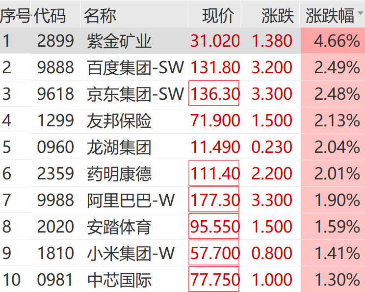 截至发稿,港股三大指数集体飘红;紫金矿业涨超4%,领涨恒指成份股。