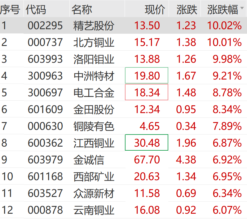 9月25日,有色金属板块盘初走高,铜产业指数领涨:精艺股份、北方铜业、洛阳钼业涨停,电工合金、铜陵有色、江西铜业等跟涨。