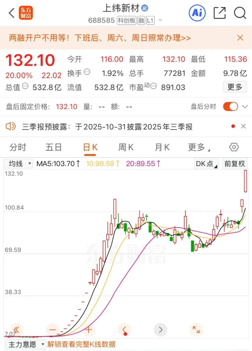 盘面上,7月以来,上纬新材因智元机器人概念股价飙升。截至9月25日收盘,上纬新材录得20%两连板,报132.1元/股。