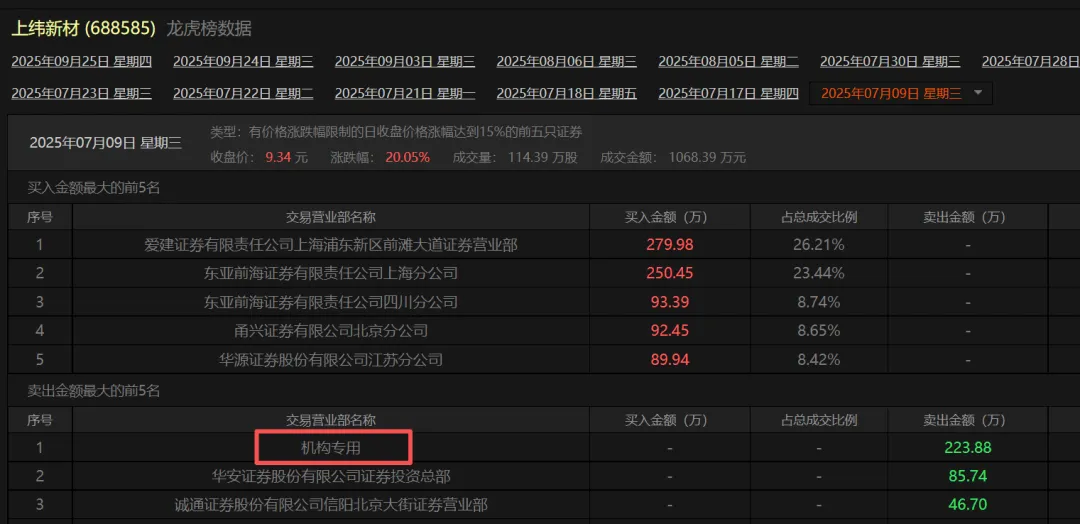 对比上纬新材前五大买方、卖方可见,7月9日第一大卖方、7月10日第二大卖方均是机构专用账户,其他均是券商分公司或营业部。