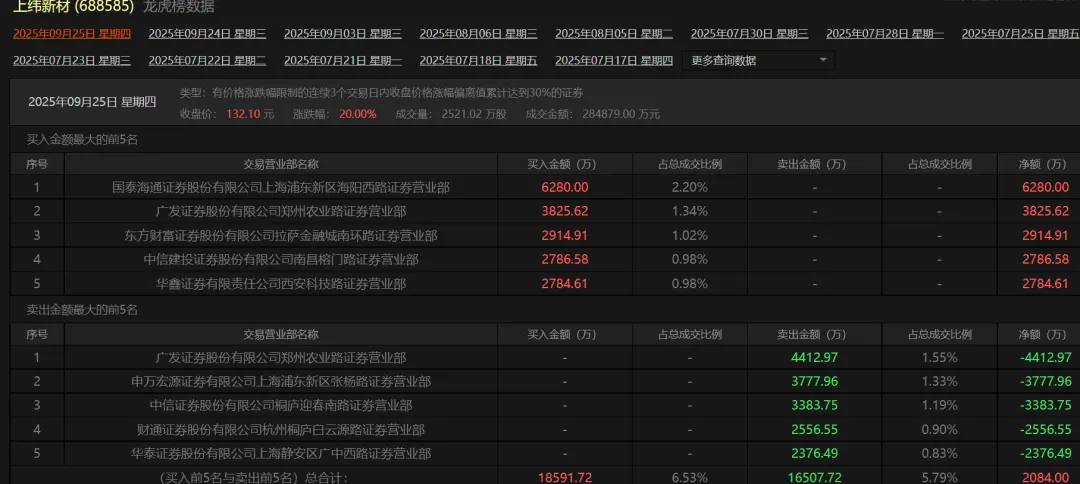 8月5日至9月25日,上纬新材合计5次登上龙虎榜,前五大买方、卖方均是券商营业部或券商子公司。