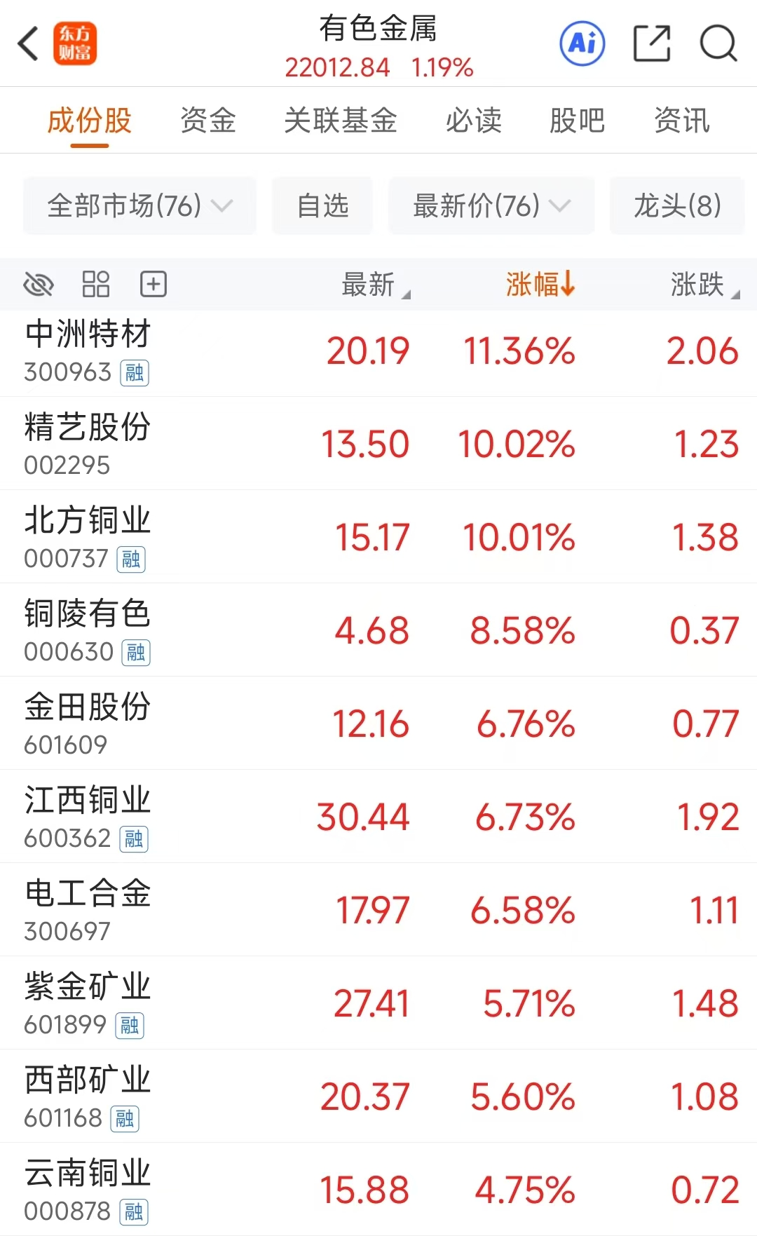 有色金属板块在9月25日早盘表现强势,其中“铜含量”较高的个股表现更强,精艺股份2连板,北方铜业涨停,铜陵有色、金田股份、江西铜业、电工合金、紫金矿业、西部矿业、云南铜业也纷纷涨幅靠前。