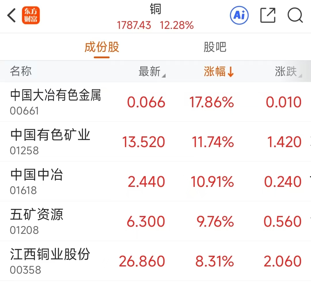 港股的铜概念股同样表现强势,截稿时,中国大冶有色金属、中国有色矿业、中国中冶均大涨超10%;五矿资源、江西铜业股份也明显拉升。