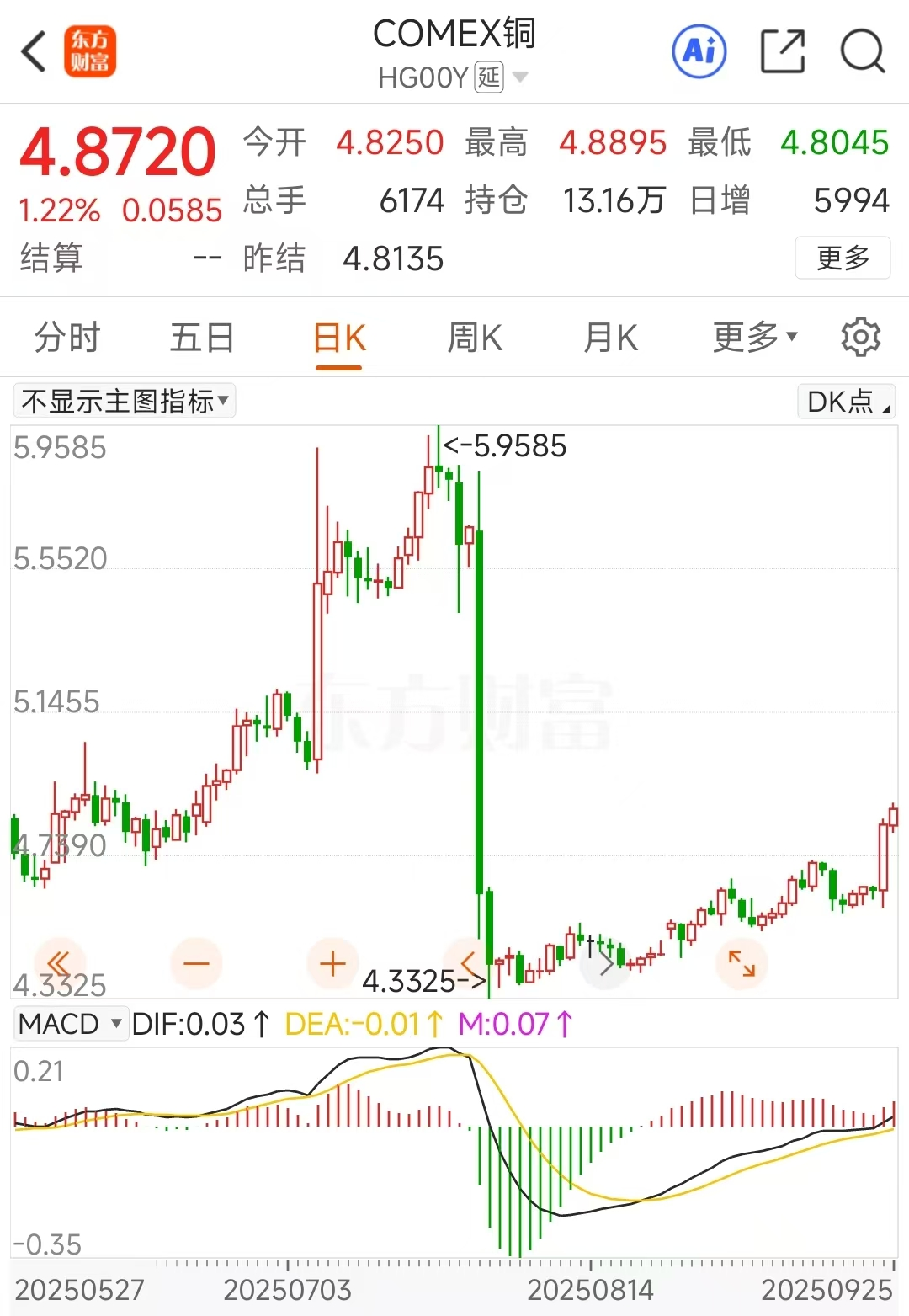 情况也确实是如此,9月24日伦铜飙升创16个月新高。纽约商品交易所(COMEX)的铜期货价格9月24日收涨3.95%。9月25日早盘,COMEX铜再次拉涨超1%。