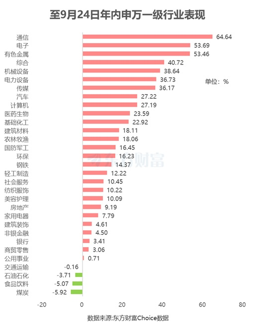 在全球通胀、金价一路狂飙的大背景下,年内有色金属板块表现强势。东方财富Choice数据显示,截至9月24日收盘,申万一级有色金属板块累计大涨53.46%,仅次于通信(+64.64%)和电子(+53.69%)。