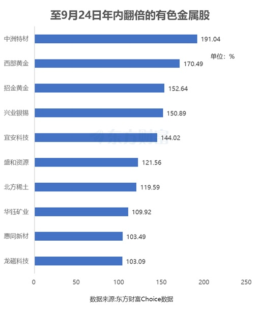 个股而言,在不考虑年内上市新股的情况下,东方财富Choice数据显示,中洲特材成有色金属板块的“涨幅王”,截至9月24日收盘的年内涨幅达191.04%。西部黄金紧随其后,年内累涨170.5%。招金黄金排在第三,年内累涨152.64%。