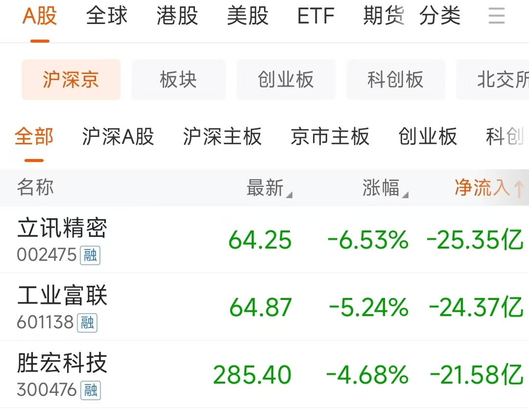 此外,从主力资金净流出排行榜来看,也能感受到消费电子的弱势,榜一、榜二便是消费电子两大龙头立讯精密和工业富联,9月26日主力资金净流出金额分别是25.35亿元和24.37亿元。