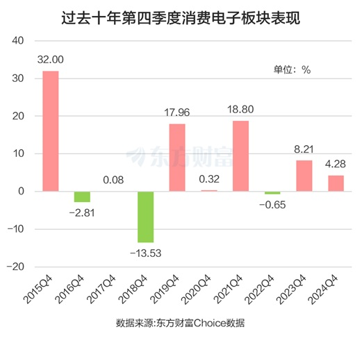不过,消费电子板块的调整,被市场普遍认为是阶段性的。因为从过往数据来看,历年第四季度,消费电子板块上涨的概率还是很大的。以申万二级消费电子行业为例,过去十年(2015年~2024年)的第四季度,消费电子板块有7年是上涨的,上涨概率为70%。其中近两个年份,2023年和2024年,消费电子在第四季度分别上涨8.21%和4.28%。
